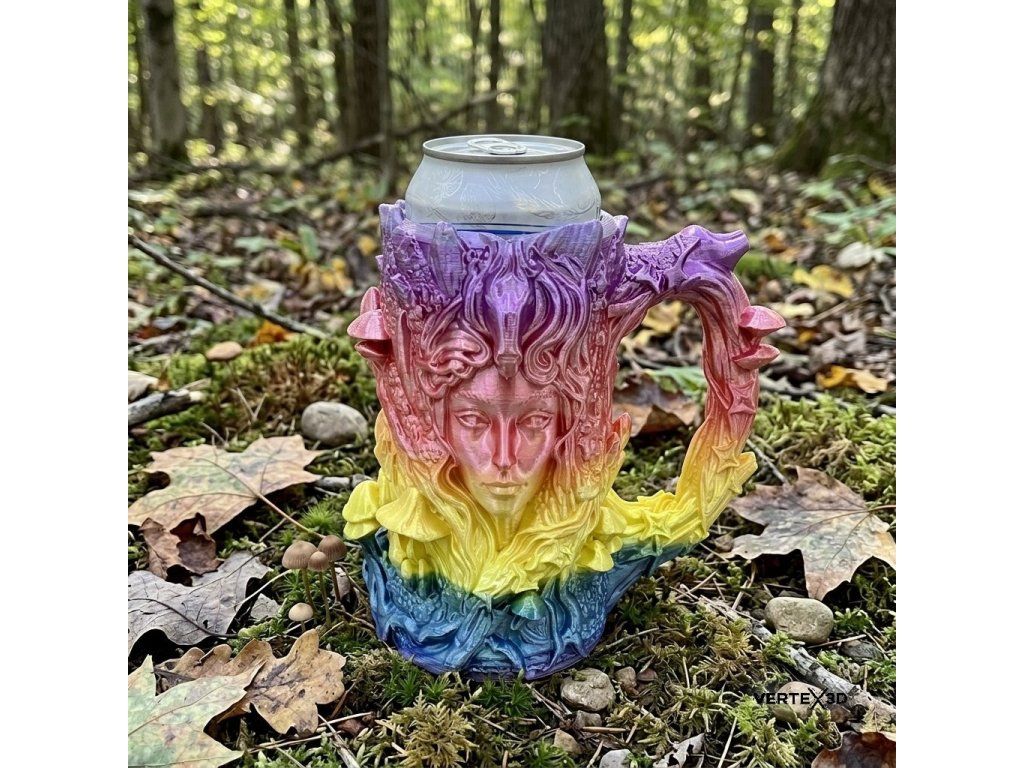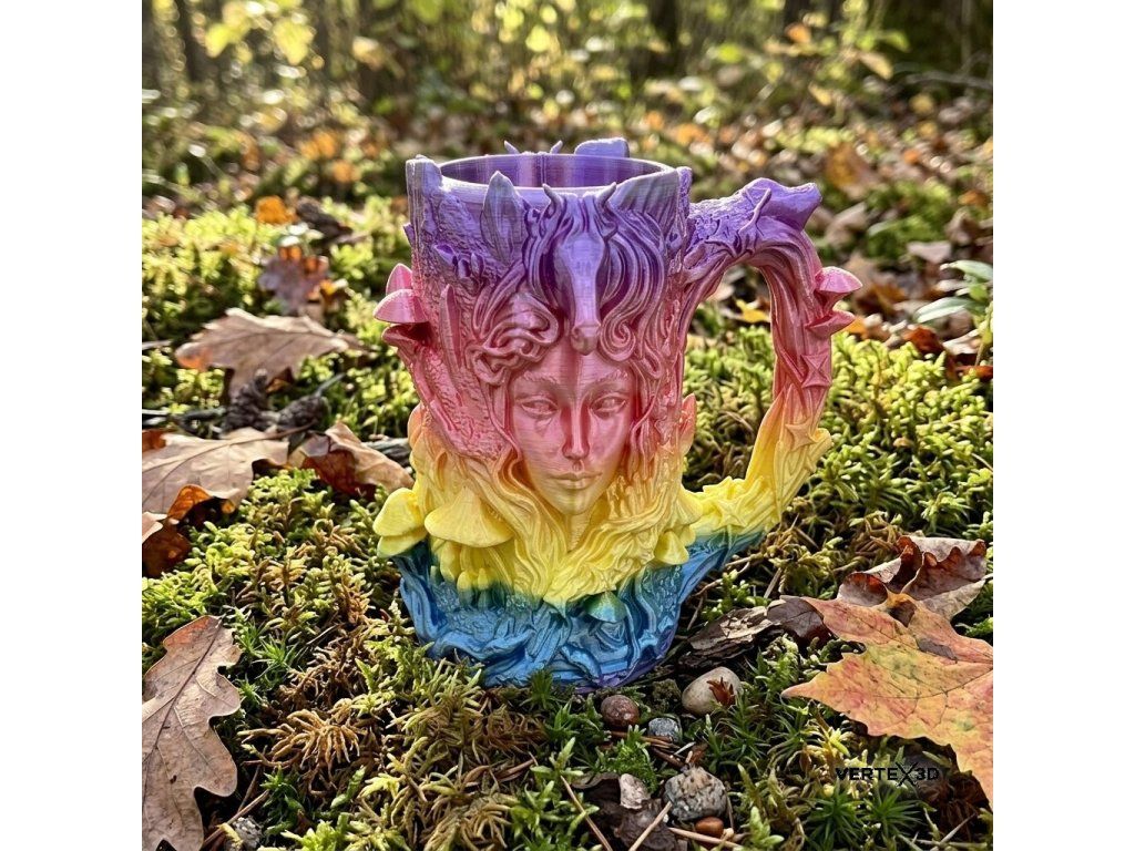 Paní lesa není jen funkčním doplňkem, je to precizně zpracované umělecké dílo, které v sobě spojuje organické tvary přírody s moderním designem. Detailní reliéf tváře lesní nymfy, obklopené divokými houbami a listy, vytváří fascinující vizuální zážitek, který ožívá s každým dopadem světla. Při držení v ruce oceníte bohatou texturu a ergonomii, která povyšuje běžné pití nápoje na výjimečný okamžik. Je to ideální společník pro večery u fantasy literatury, stolních her nebo jako dominantní estetický prvek na vašem pracovním stole.
